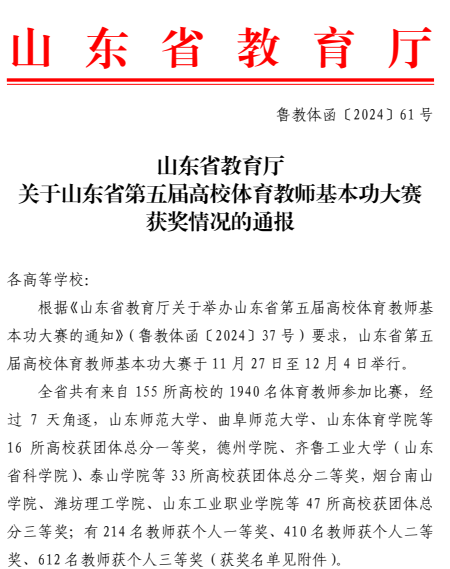 近日,山东省第五届高校体育教师基本功大赛圆满落幕。今年会选派的10位体育教师表现出色,经过激烈角逐,获得一等奖1项、二等奖2项、三等奖4项,并荣获团体三等奖,实现了学校在该赛事上的突破。
