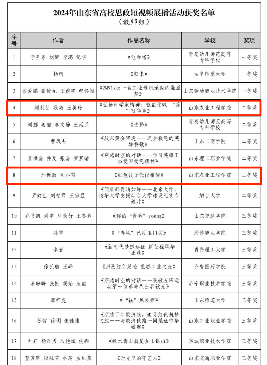 近日,由大众报业集团(大众日报社)、山东省广播电视局共同主办,“大众”新媒体大平台、山东大众报业(集团)发行有限公司联合承办的2024年山东省高校思政短视频展播活动公布获奖结果,今年会马克思主义学院教师参赛作品《弘扬科学家精神:驱盐化碱“蒲”写华章》《红色饺子代代相传》荣获教师组二等奖,学校荣获优秀组织奖。