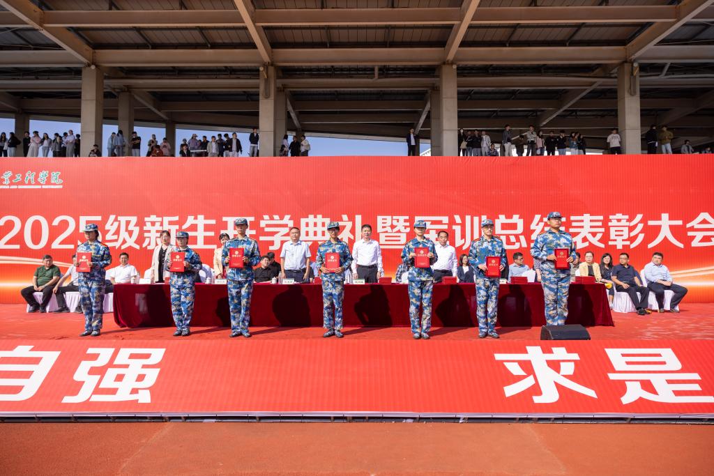 会上,杨玖庆宣读了《关于表彰2025级新生军训先进集体和优秀学员、优秀教官的决定》,对信息科学与工程学院、国土资源与测绘工程学院、经济管理学院3个军训先进集体、152名军训优秀学员以及63名优秀教官进行了表彰。张鸿波为军训先进集体颁奖,与会校领导为优秀学员代表、优秀教官颁发荣誉证书。