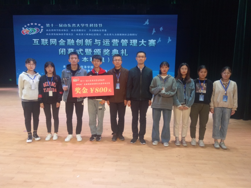 10月20日,在第十一届山东省大学生科技节互联网金融创新与运营管理大赛(本科组)比赛中,经管学院2017级金融工程专业学生张浩安、邵林林、吕静、王晓丽组成的“对月如钩”队获得一等奖及奖金(总分第2名),崔晶、谷美、曹薇、樊晓组成的“资资不倦”队获得二等奖(总分第10名)。赵宏、王鹏、孙萌、周海霞获得优秀指导老师称号。
