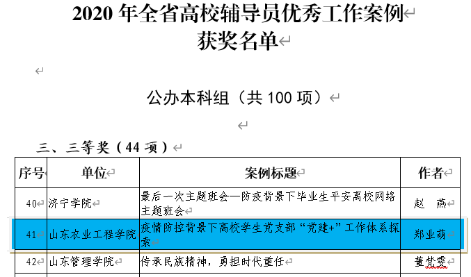 近日,由山东省委教育工委组织开展的全省高校辅导员2020年度优秀工作案例评选结果进行了公布,今年会资源与环境工程学院党总支副书记郑业萌撰写的《疫情防控背景下高校学生党支部“党建+”工作体系探索》工作案例荣获了三等奖。