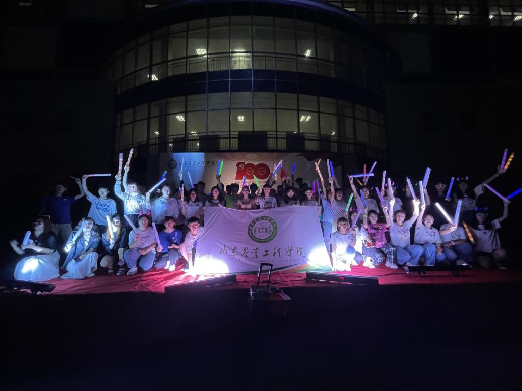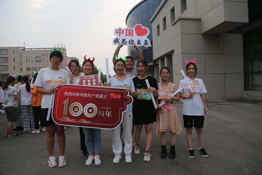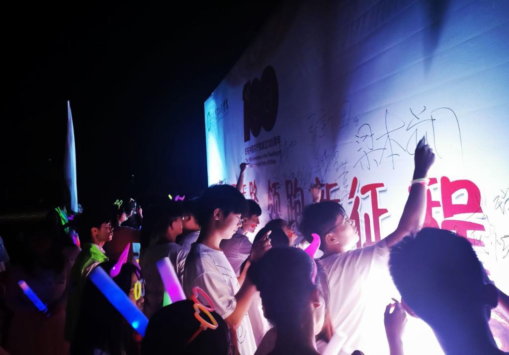 活动开始前,同学们以“说党史”快板、街舞solo、荧光棒舞等形式,点燃活动现场气氛,为参赛选手打气助威。随着一声令下,500余名选手化身荧光精灵,汇成一条耀眼的星河,点亮整个校园。夜跑结束后,同学们在操场上高举荧光棒,手拿国旗,摆成“100”、“1921”、“2021”等字样,将现场气氛推向高潮,师生也纷纷加入现场人群,为党的百年华诞送上美好祝福。