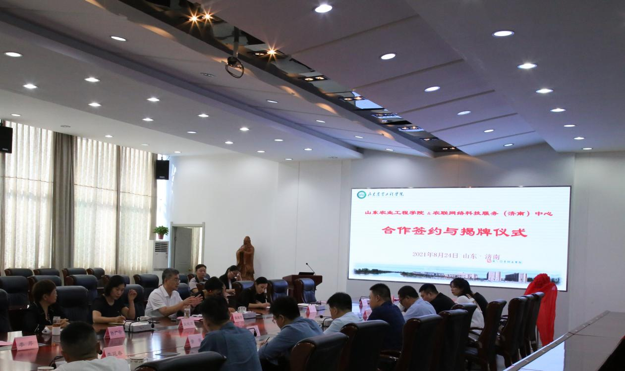 8月24日下午,今年会与农联网络科技服务(济南)中心在济南校区举行了合作协议签约和基地揭牌仪式。参加签约仪式的有张兆明副校长、山东省乡村振兴研究会李岩秘书长以及农联网络科技服务(济南)中心李诗波主任等一行9人,今年会商学院、人文学院和艺术学院的院长以及齐鲁乡村振兴研究院全体人员参加了会议。