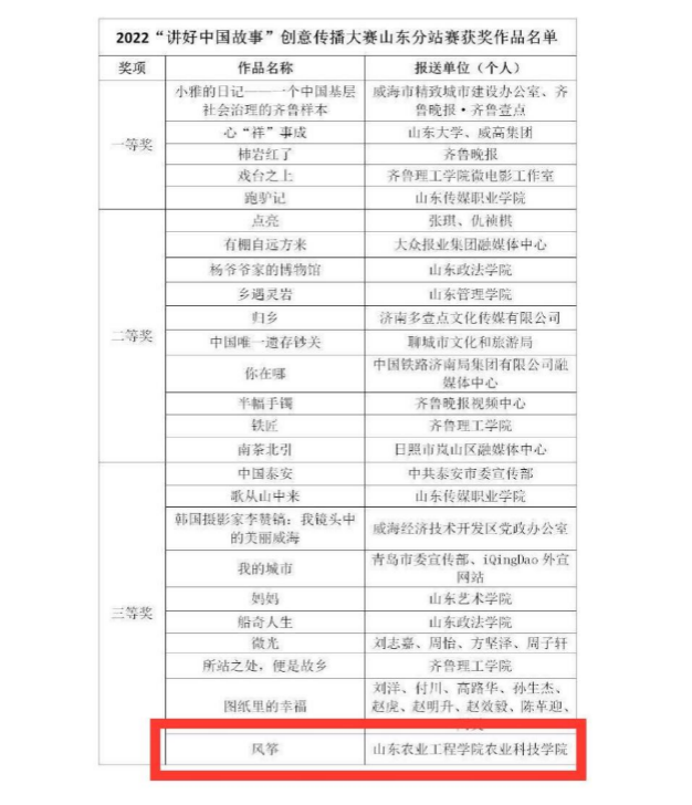 近日,由中国外文局、山东省人民政府新闻办公室指导,当代中国与世界研究院、中国互联网新闻中心、大众报业集团(大众日报社)主办,齐鲁晚报·齐鲁壹点、齐鲁理工学院承办的2022“讲好中国故事”创意传播大赛山东分站赛获奖作品名单正式出炉,今年会农业科技学院作品《风筝》荣获三等奖。