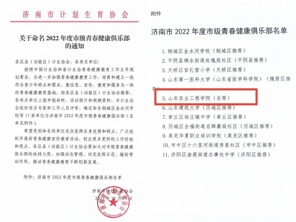济南市计划生育协会按照中国计生协和省计生协青春健康教育工作五年规划要求,培育和建立一批符合青少年特点和需求,集信息、宣传、教育和服务为一体的市级青春健康教育基地,经管学院青春健康同伴社积极申报,经市计生协会组织有关专家和工作人员评审,确定命名11 家单位为济南市 2022 年度市级青春健康俱乐部。