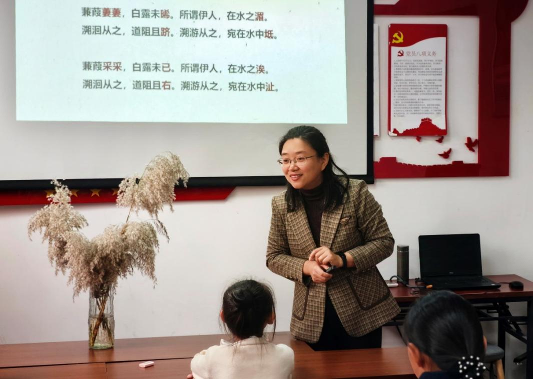 本次课堂以《诗经·秦风》中的经典篇章《蒹葭》为活动主要内容。李秀娟老师通过视频、PPT展示和现场互动等多种生动的讲课方式,带领小朋友们认识植物蒹葭及其价值,学习《蒹葭》这首诗歌的意境与情感,领略中国古典诗歌的魅力,鼓励大家学会以美学的眼光观察自然、感悟生活,把传统文化与鲜活的生活体验密切结合。