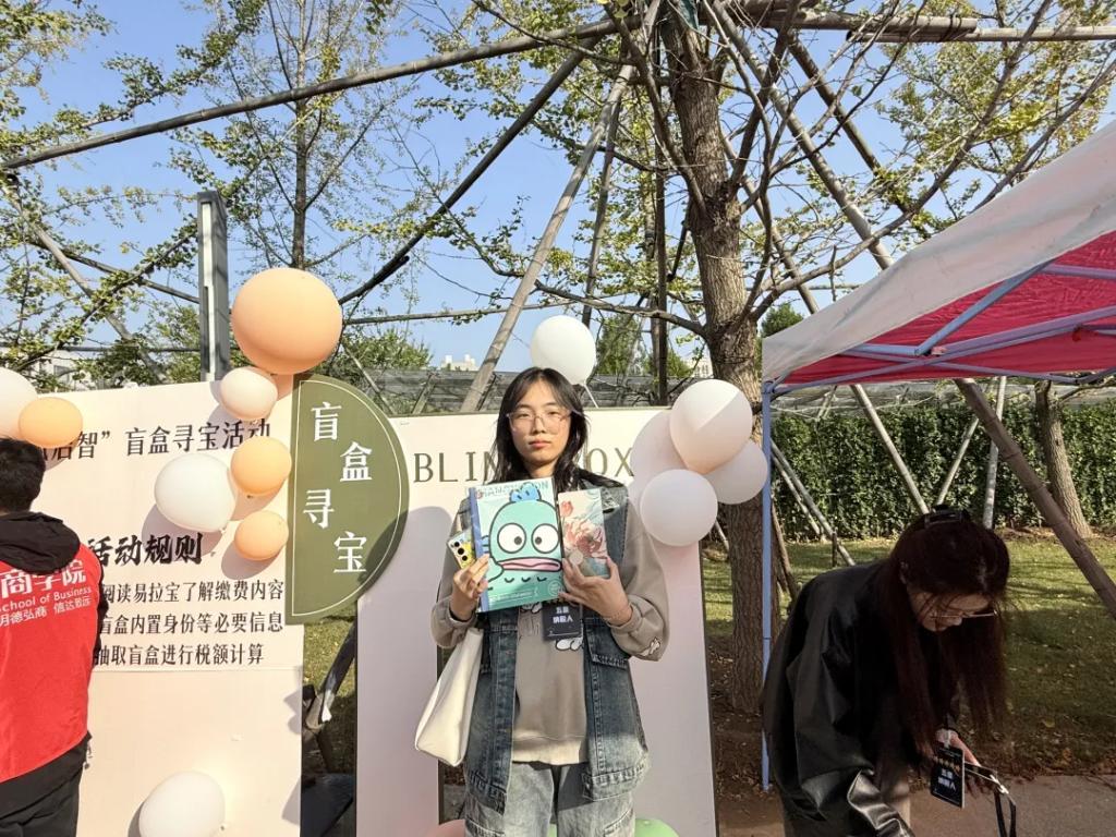 本次活动在学院的全面统筹下策划实施,旨在通过结合学院专业特点,以居民个人所得税为主题展开。为了提高学生们的兴趣和参与度,特别设计了广受欢迎的盲盒寻宝环节。参与者有机会从盲盒中随机抽取不同的职业角色卡片,每张卡片附带该角色的相关纳税信息。依据活动现场设置的税务知识展示板提供的信息,学生们能够计算出对应职业角色所需缴纳的个人所得税额,正确完成任务的同学将被授予“五星纳税人”的荣誉头衔。活动不仅让学生们掌握了实用的生活技能,还加深了他们对于依法纳税重要性的理解,在心中播下了公正廉洁的种子。