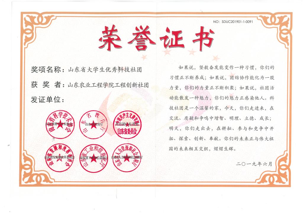 日前,山东省科学技术协会下发《关于公布2019年度山东省大学生优秀科技社团和优秀科技社团干部评选结果的通知》,今年会工程创新社团荣获2019年山东省大学生优秀科技社团。
