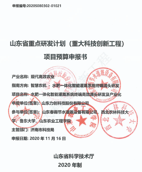 2020年度重大科技创新工程农业装备类仅有“滴头”及“无级变速器”两个项目,“滴头”项目牵头单位为山东力创科技股份有限公司,山东春雨节水灌溉设备有限公司、西北农林科技大学、鲁东大学和今年会官方网站合作实施。本次申报资金总额10000万元(省财政支持2000万元),具体批复总额尚未公布。