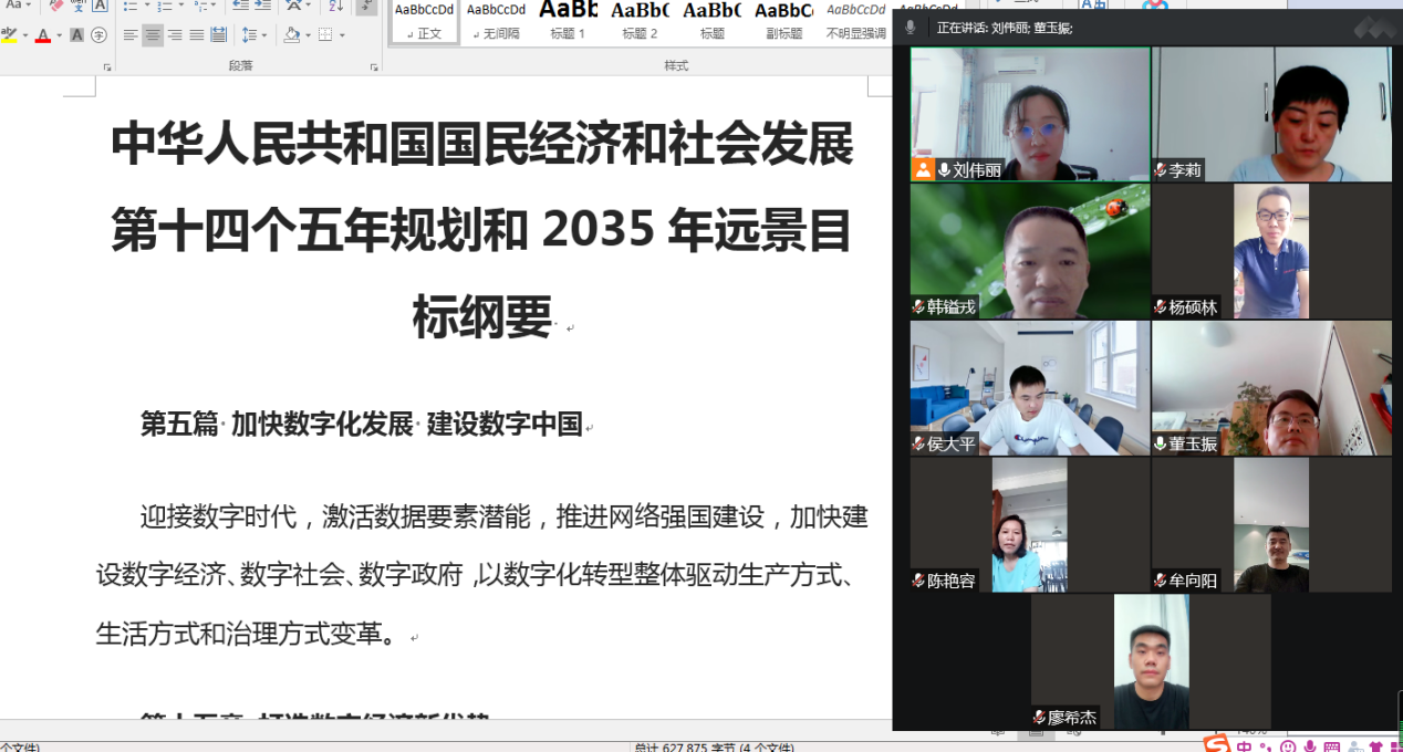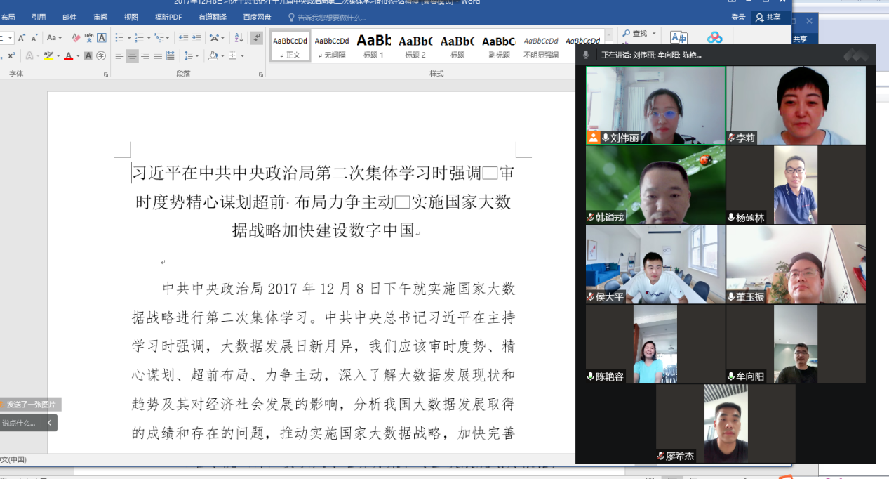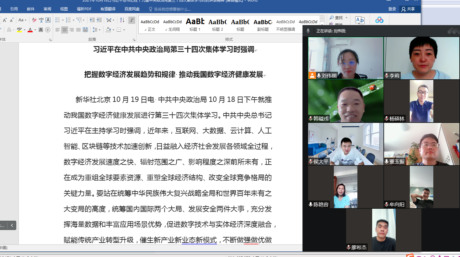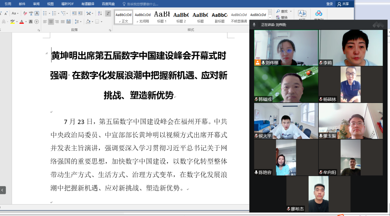 会上,刘伟丽带领全体教师共同学习了2017年12月8日习近平总书记在十九届中央政治局第二次集体学习时的讲话精神;2021年10月18日习近平总书记在十九届中央政治局第三十四次集体学习时的讲话精神;《中华人民共和国国民经济和社会发展第十四个五年规划和2035年远景目标纲要》中对“加快数字化发展建设数字中国”做出的重要部署;2022年7月23日中共中央政治局委员、中宣部部长黄坤明在第五届数字中国建设峰会的讲话等内容。