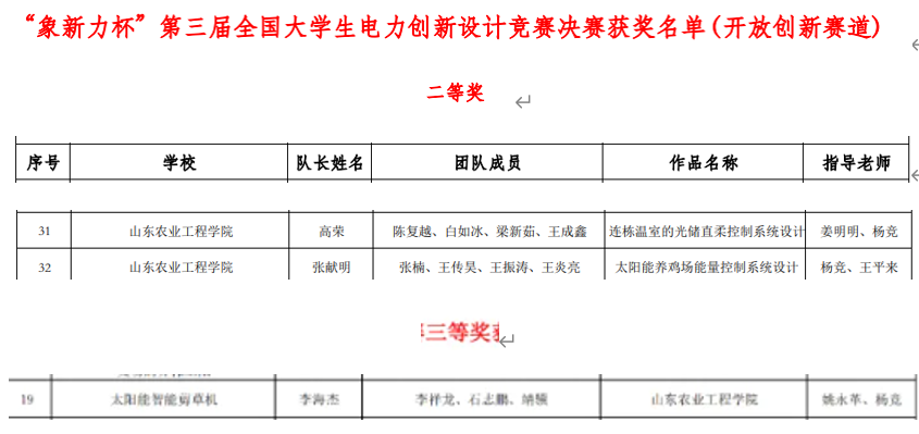 “象新力杯”全国大学生电力创新设计竞赛是电力领域最有影响力的赛事,它是大学生展示自我、挑战自我的重要平台,也是促进产学研深度融合、推动电力行业技术进步与产业升级的关键桥梁。比赛在上海电力大学(临港校区)举行,一共有 244所高等院校和职业院校的1276支参赛队伍参加比赛,其中277支参赛队伍进入决赛。我院共有五支队伍参加比赛,其中由杨竞、王平来两位老师指导的《太阳能养鸡场能量控制系统设计》和姜明明、杨竞两位老师指导的《连栋温室的光储直柔控制系统设计》获得国家二等奖,由姚永革、杨竞两位老师指导的《太阳能智能剪草机》获得国家三等奖。