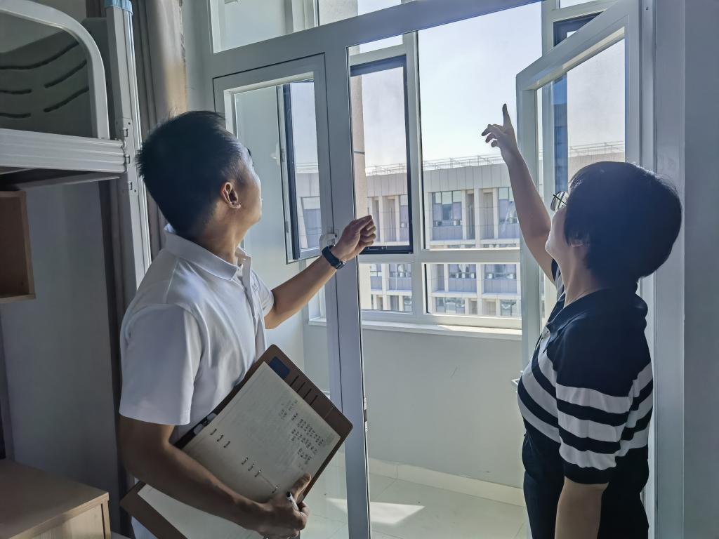 李艳书记带队检查了新生各项生活基础设施和防火门的使用情况,针对学生宿舍内的安全逃生出口提出了整改建议。赵侃书记着重查看了宿舍内的各项硬件设施,对宿舍内的电器开关、空调等房间配套设施逐项检查并及时记录,并对检查中发现的各项问题提出了整改意见,力求为新生入住提供安全舒适的环境。