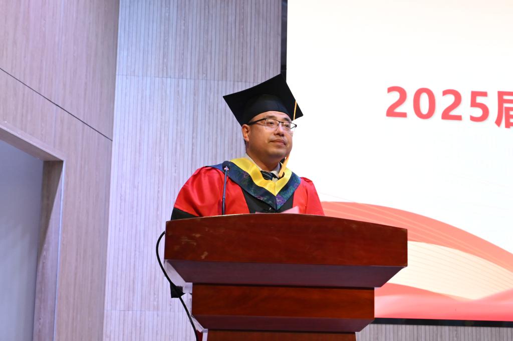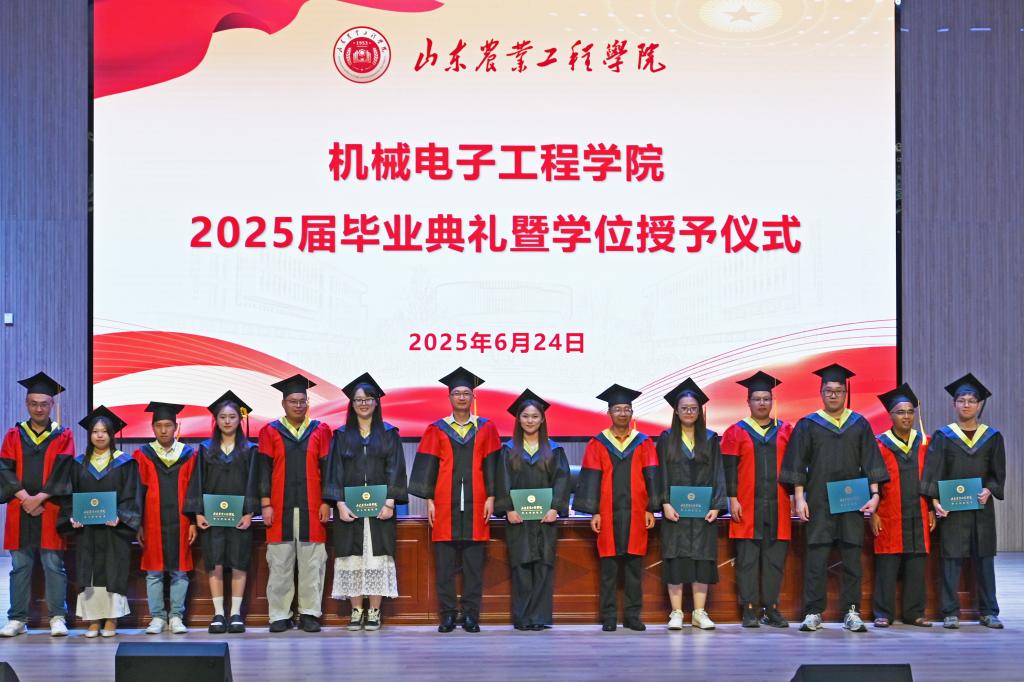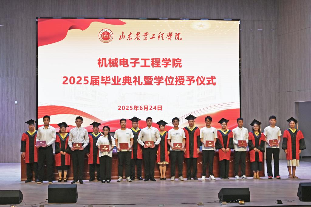 毕业典礼暨学位授予仪式在庄严的国歌下正式开始,全体起立,奏唱国歌。机械电子工程学院院长赵志桓发表致辞,他深情回顾了同学们在机电学院的成长点滴,并寄语毕业生们三句话:一要胸怀家国,把青春奋斗融入强国复兴征程;二要锚定青春目标,奋斗青春梦想;三要终身学习,敢于创新,在未来的挑战中不断精进。随后,由学院副院长李震宣读2025届毕业生毕业的决议,学院领导为2025届毕业生代表颁发毕业证书。