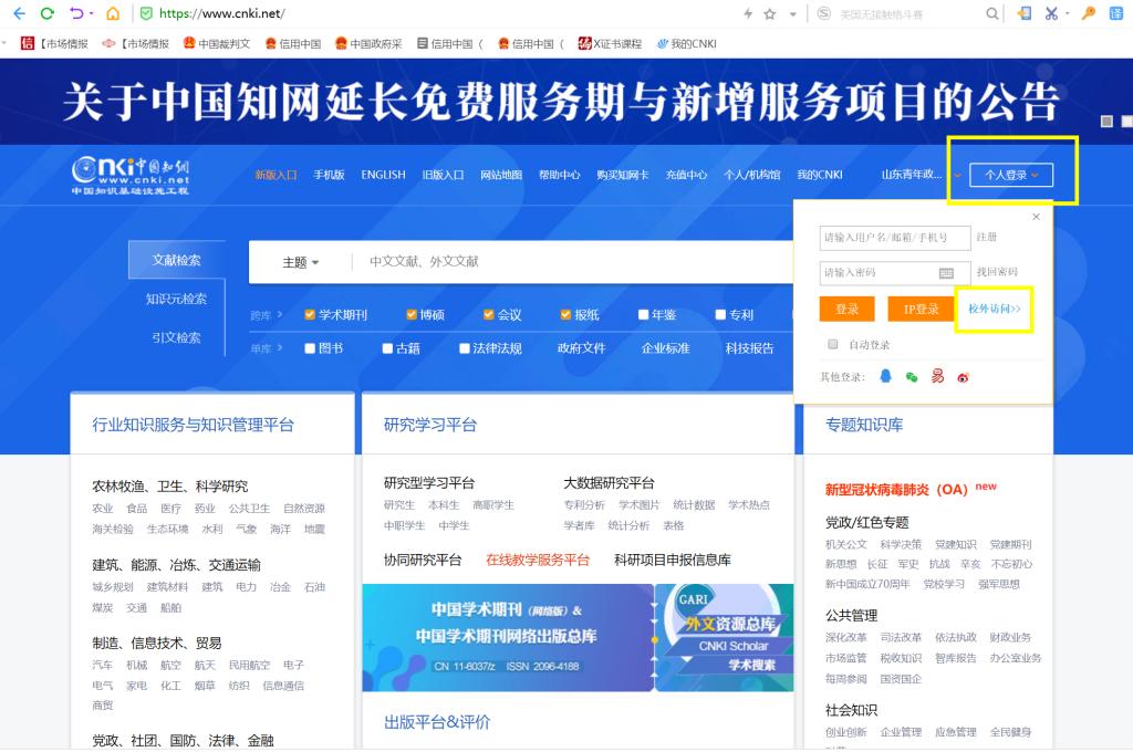 2.第二种方式:直接登录CNKI官方网站www.cnki.net,点击个人登录,选择‘校外访问’,具体如下图: