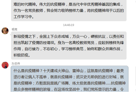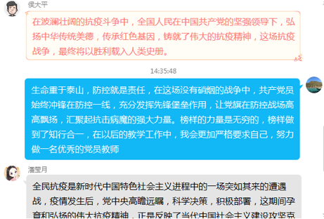 本次活动首先安排教工2支部党员通过“灯塔-党建在线”网络平台收看了部分“抗疫榜样”在抗击新冠肺炎疫情期间敢于牺牲、勇于担当、敬业奉献的感人故事和事迹。这场特殊的党课鞭策着我们每个人要牢记共产党员的使命和担当,以更加饱满的热情投身到日常工作、学习中,切实发挥共产党员的先锋模范作用,用优异的成绩向我们党交一份满意的答卷。党员教师结合自身“抗疫”经历,通过QQ群分享了自己的体会和收获。