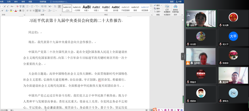 会上刘伟丽组织全员一起学习了“习近平代表第十九届中央委员会向党作的党的二十大报告”,全体老师畅谈了个人对党的二十大报告学习的体会和心得。