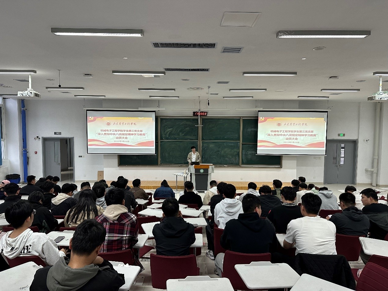 为认真学习贯彻习近平总书记关于深入贯彻中央八项规定精神学习教育的重要讲话和重要指示精神。3月26日晚,我院学生第三党支部在淄公北楼B202教室召开支部党员大会举行深入贯彻中央八项规定精神学习教育动员会。支部全体党员参加,会议由支部书记胡晓龙主持。