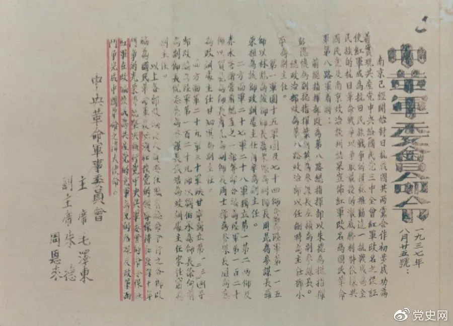 1937年8月25日,毛泽东和朱德、周恩来发出的关于红军改编为国民革命军第八路军的命令。 图片来源:中央党史和文献研究院
