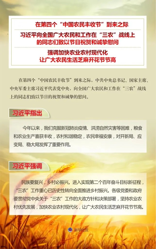 习近平总书记指出:“设立中国农民丰收节,是党中央研究决定的,进一步彰显了‘三农’工作重中之重的基础地位,是一件影响深远的大事。”
