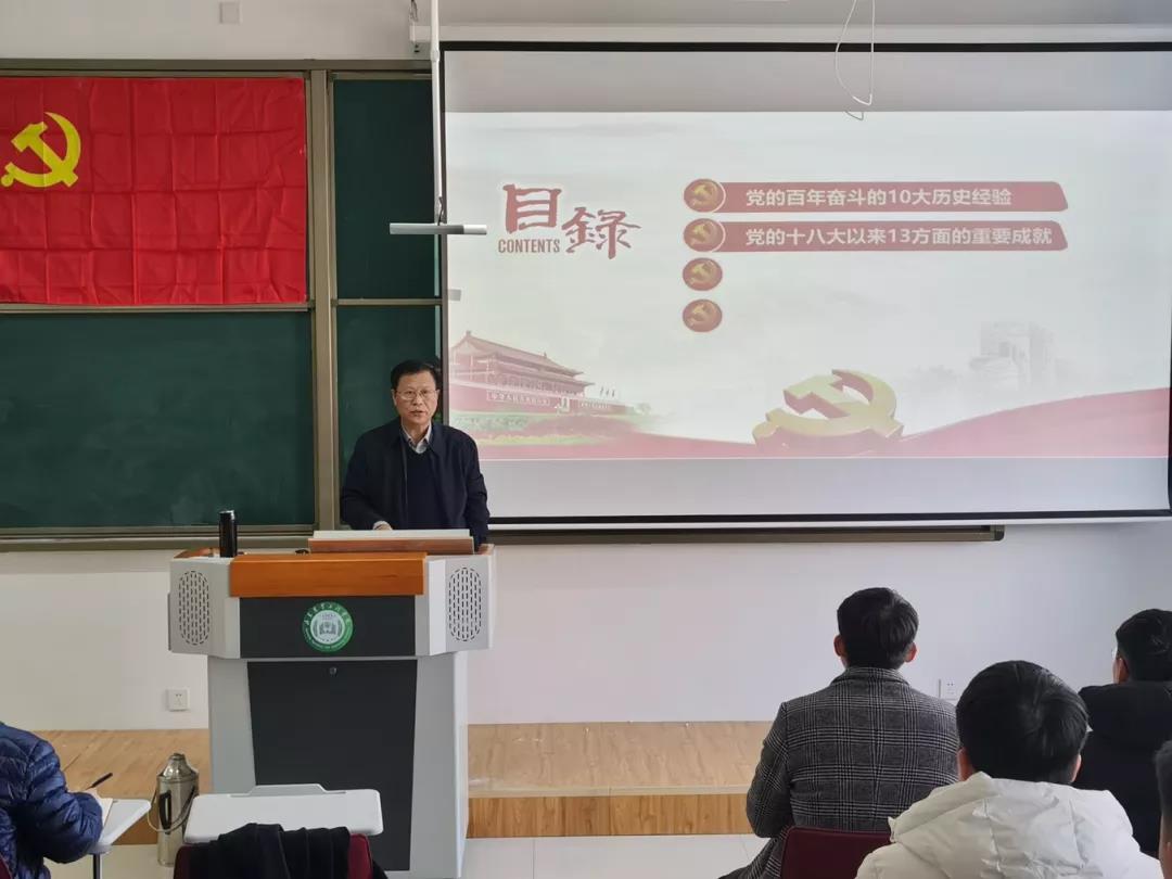 杨振宁副校长从审议通过的2个文件、百年历程创造的4个伟大成就、党的百年奋斗的5大历史意义等九个方面,向与会人员进行了全面系统的党的十九届六中全会精神的讲解。杨校长指出,全体党员要准确把握《决议》内容,深入学习党的十九届六中全会精神,深刻认识总结党的百年奋斗重大成就和历史经验的重大意义,深刻认识党的百年奋斗的初心使命和重大成就,深刻认识中国特色社会主义新时代的历史性成就和历史性变革,深刻认识党的百年奋斗的历史意义和历史经验,深刻认识以史为鉴、开创未来的使命担当,进一步增强“四个意识”、坚定“四个自信”、做到“两个维护”。