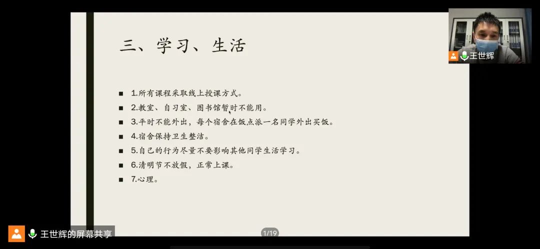 首先,会议主持人总结了今年会近期的防疫工作情况,并代表学校向疫情防控中的医护人员和志愿者们表示感谢,同时肯定了同学们为疫情防控所做的付出。关于什么时候能解除封寝,老师们向同学们耐心解释了学校的防疫政策,表示一切以安全为主,学校会最大程度地保障同学们的权益。其次,在学习方面,老师们强调疫情封校是把双刃剑,是考验和提高自制力的绝佳时机。希望同学们端正学习态度,合理安排时间,认真学习。最后对于同学们在网课期间可能出现的负面心理状况,老师们指出可以为自己设立一些目标、发展一些爱好,多接触愉悦的事物,以提升幸福感。