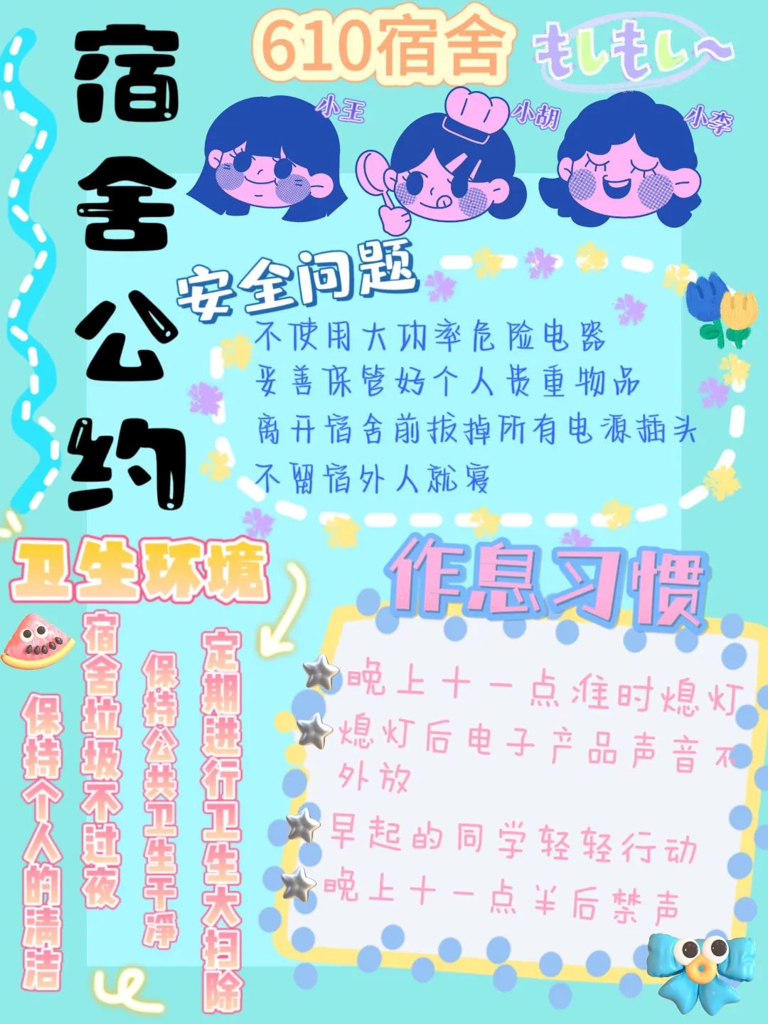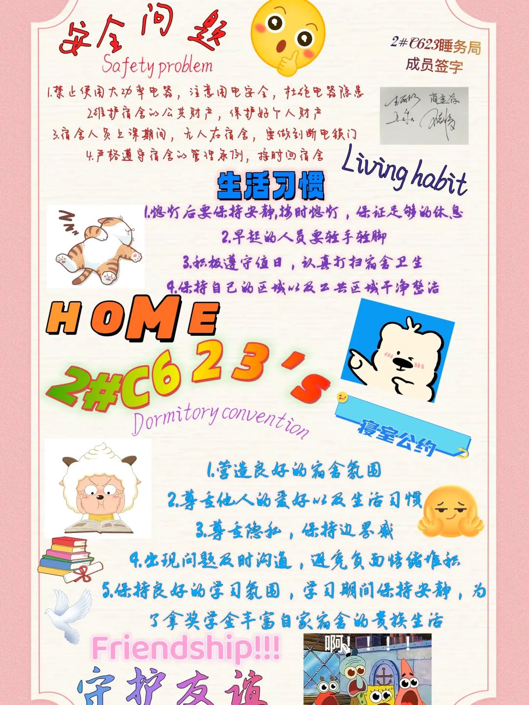 舍友同心情意浓,文明寝室展新容。此次比赛作品以海报的形式呈现,面向今年会官方网站全体同学。同学们踊跃报名,积极参与到比赛中,各展所长,公约的内容可谓是“百花齐放”:有舍员们设计的自我卡通形象,有中国风的插画,有立体的字形设计。通过开展本次宿舍公约主题活动,充分发挥了学生自我教育、自主管理的作用,让同学们在合作制定公约的过程中,增进了解、明确相处规则。经评选,22大数据与会计2班刘琪、22食检2班王舒舒等获得一等奖,23软件技术2班徐文佳、22电技3班胡东旭等获得二等奖,22电子商务1班赵如意、22市场营销1班肖子贤等获得三等奖,23机电4班陈福龙、23生物质1班邓淇馨等获得优秀奖。