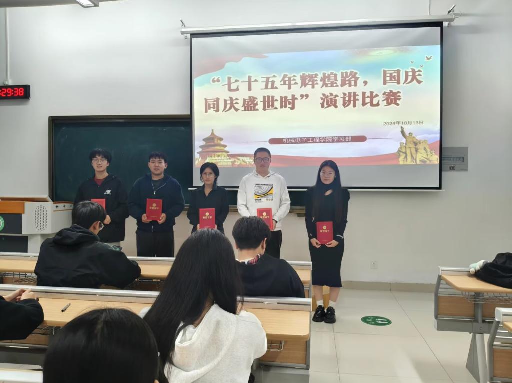 为庆祝中华人民共和国成立75周年,弘扬爱国主义精神,激发同学们的民族自豪感与责任感。机械电子工程学院于10月13日在淄公北楼B110教室举办“七十五年辉煌路,国庆同庆盛世时”主题演讲比赛。此次比赛由我院学生会学习部承办。