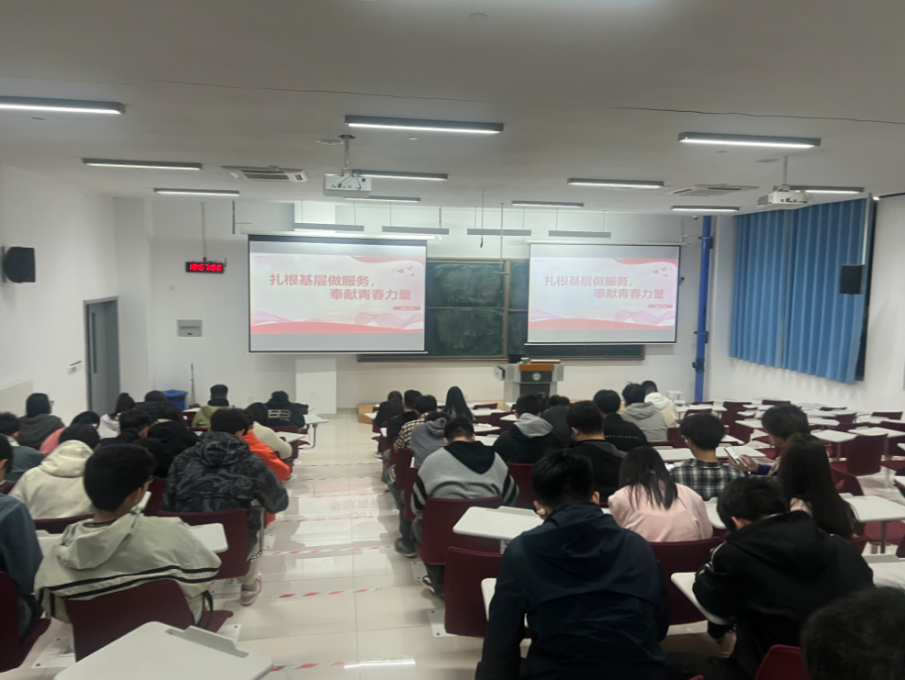 讲座中,优秀校友赵乐乐、鹿维宁分别从政策与实践维度展开分享。赵乐乐聚焦“山东省大学生志愿服务乡村振兴计划”的政策沿革,解析志愿者保障政策及报名流程,指导岗位选择要点。鹿维宁以“青春作笔,绘西部绮梦长卷”为题,从成长、家国、价值三方面阐释初心,通过基层影像展示党政办政务统筹、包村走访调研、法治矛盾调解等实践,生动呈现基层服务的责任担当。