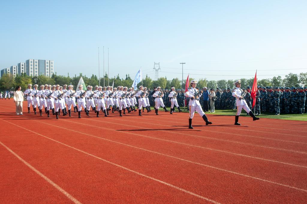 在雄壮的国歌声中,五星红旗缓缓升起,全体师生肃立注目,大会在此正式启幕。机械电子工程学院400余名新生分为5个连队进行分列式展示,依次入场接受检阅。他们以昂扬之姿入场,如松柏般挺拔的身姿、如钟摆般整齐的步伐,在绿茵场上划出青春的轨迹。“向右看!”嘹亮的口号声中,新生们目光如炬,帽檐下锐利的视线划出整齐的弧线。他们动作利落,整齐划一,挺拔的身姿中展现出机电学子坚韧不拔、追求卓越的精神风貌。