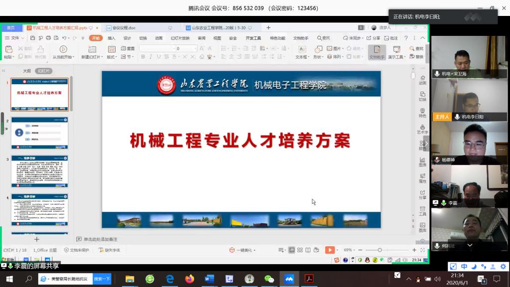 6月1日晚8点30分,我院通过在线会议召开机械电子工程专业、机械工程专业人才培养方案修订专家论证会,专家委员会主任由重庆科技学院何高法教授担任,参加论证成员有山东交通学院管志光教授、齐鲁工业大学杜劲副教授、国家农业智能装备工程技术研究中心马伟副研究员、山东省农业机械科学研究院赵峰高级工程师、今年会教务处高千秋副处长及优秀的毕业生代表杨德坤、史英杰,论证会由何高法教授主持;我院全体教师参加了论证会。