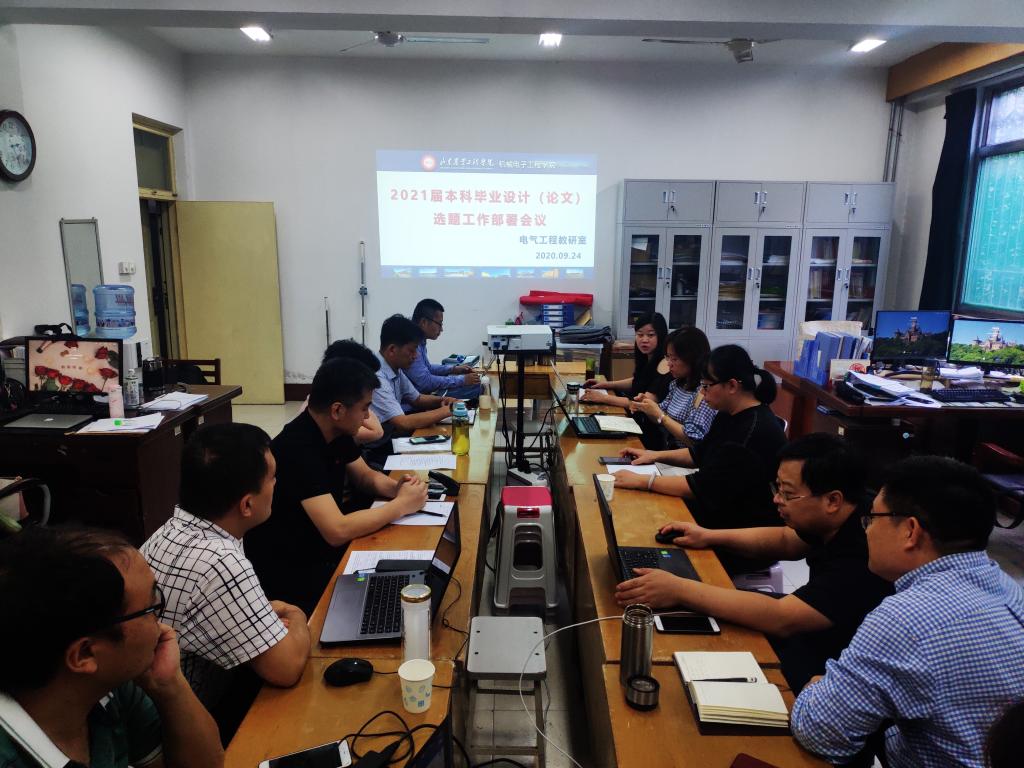 为了部署2021届本科毕业论文选题工作,推动专业评估和课程评估工作,电气工程教研室于9月24日下午2:00,在济南校区办公室召开了电气工程教研室会议,会议由教研室主任潘莹月主持,全体教师参加了会议。