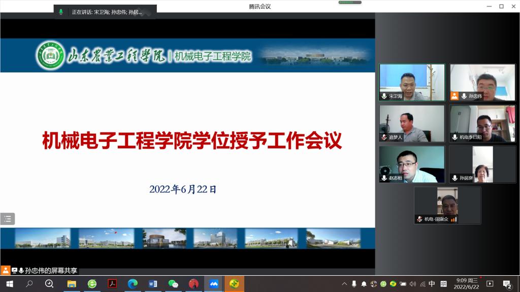 2022年6月22日,机械电子工程学院举行学位授予工作会议,会议在线上平台召开,学院学位评定分委员会成员参与了会议,会议由院长宋卫海主持。