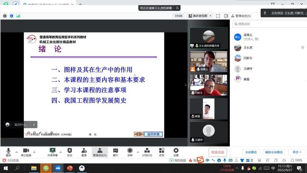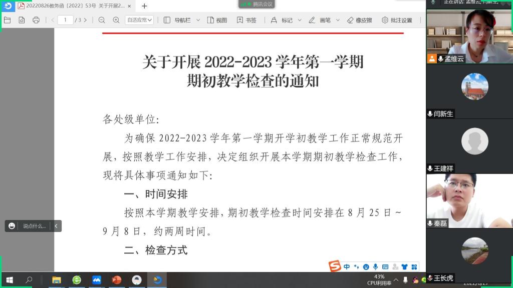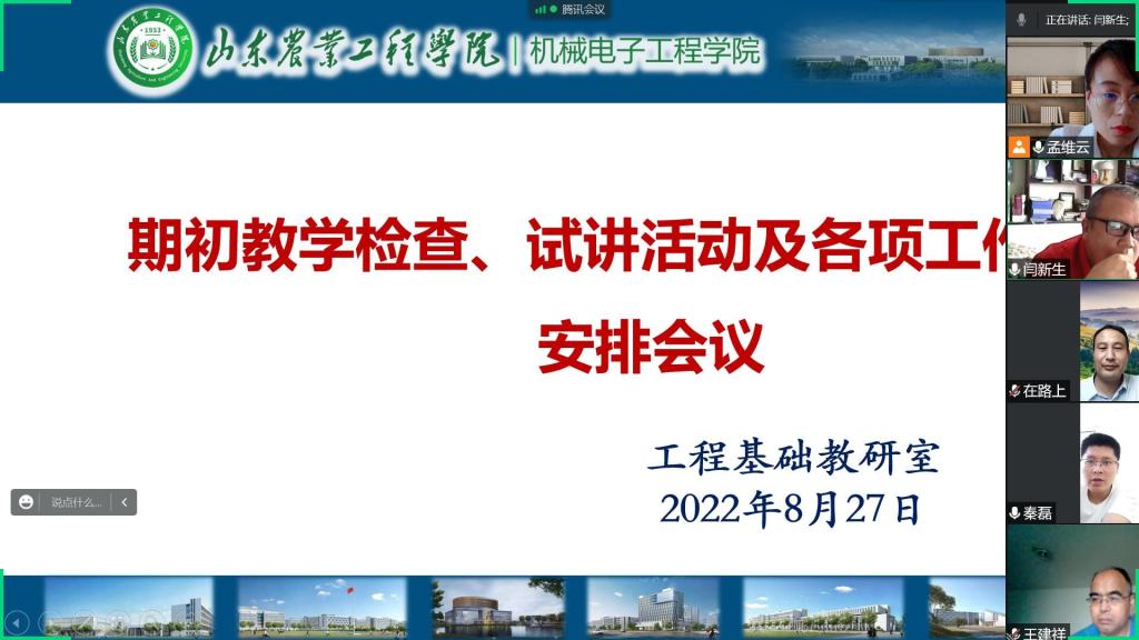 为了全面落实新学期各项教学工作,工程基础教研室于2022年8月27日下午线上召开新学期教学工作会议,开展期初教学检查、试讲活动。会议由教研室主任孟维云主持,教研室全体教师参加了会议。