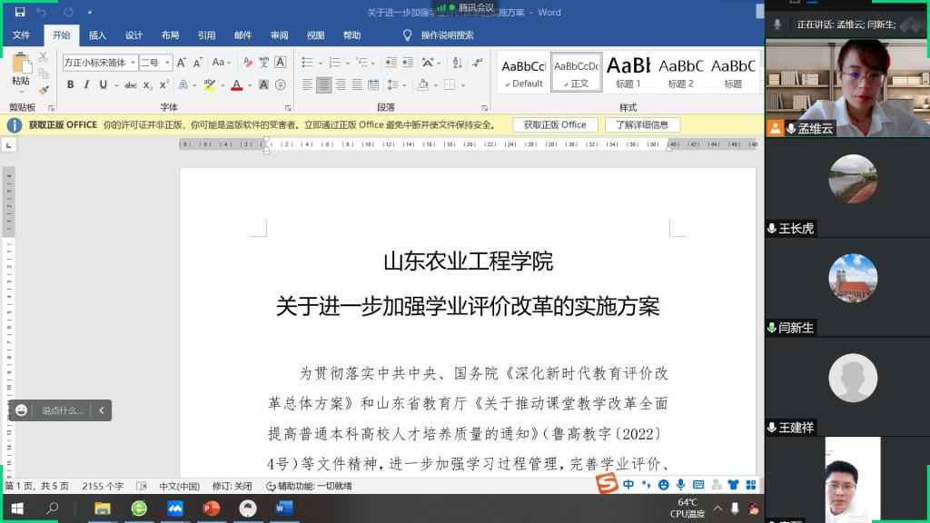 孟维云宣读了《关于开展2022-2023学年第一学期期初教学检查的通知》,要求大家提高认识,严格按照通知要求,认真落实,确保本学期教学工作有序展开。会上还对《关于进一步加强学业评价改革的实施方案》进行了学习,各位老师对方案进行了讨论。另外,会议就疫情防控、毕业设计(论文)抽检、试卷归档等多项工作进行了安排。孟维云强调教学是我们工作的重中之重,全体老师都要在持续学习的过程中不断提高教学能力,严抓课堂教学质量,认真上好每一堂课。