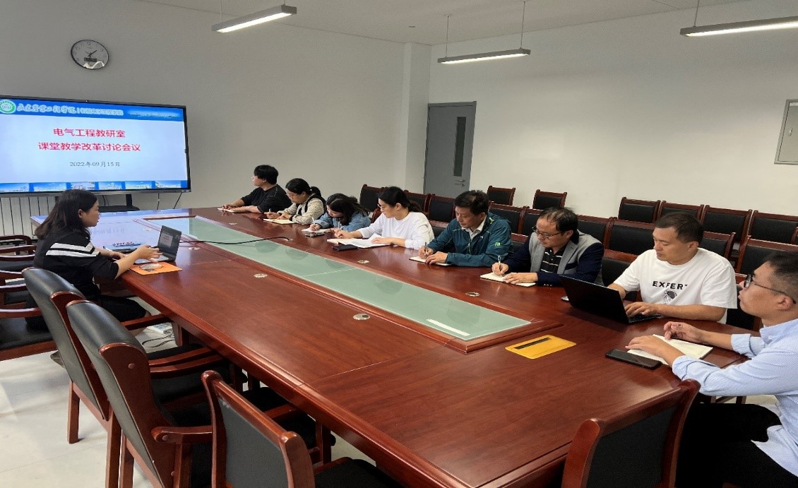 2022年9月15日下午,电气工程教研室全体教师在淄博校区理工东楼B304开展课堂教学改革研讨活动,潘莹月主任带领教师们学习了学校关于推进课堂教学改革实施的相关文件。