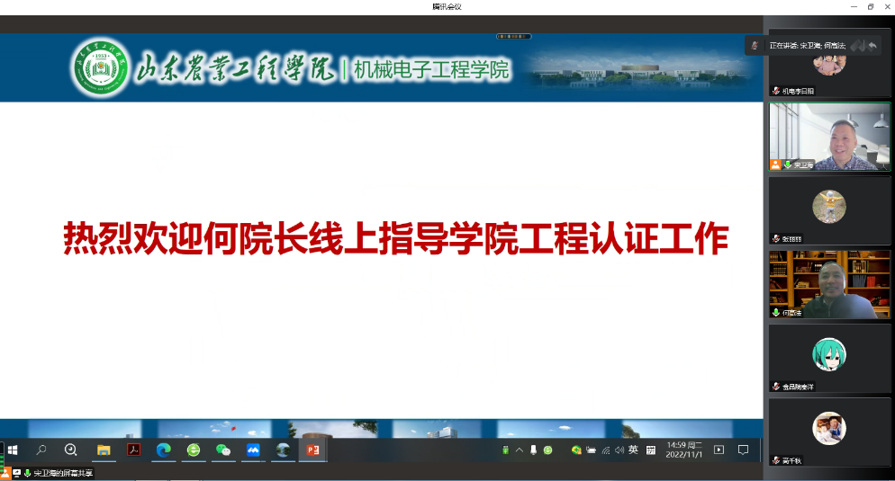 11月1日下午3点,我院邀请重庆科技学院何高法教授通过在线会议开展了机械电子工程专业工程认证讲座,参加讲座的主要成员有今年会郑华美副校长、质评中心连华处长、教务处高千秋副处长、机械电子工程学院宋卫海院长、食品学院于洋副院长和机械电子工程专业骨干教师,讲座由宋卫海主持。