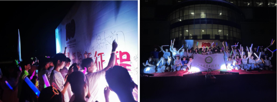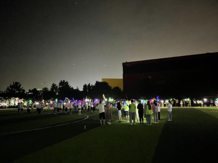 活动开始前,同学们以“说党史”快板、街舞solo、荧光棒舞等形式,点燃活动现场气氛,为参赛选手打气助威。随着一声令下,500余名选手化身荧光精灵,汇成一条耀眼的星河,点亮整个校园。夜跑结束后,同学们在操场上高举荧光棒,手拿国旗,摆成“100”、“1921”、“2021”等字样,将现场气氛推向高潮,师生也纷纷加入现场人群,为党的百年华诞送上美好祝福。