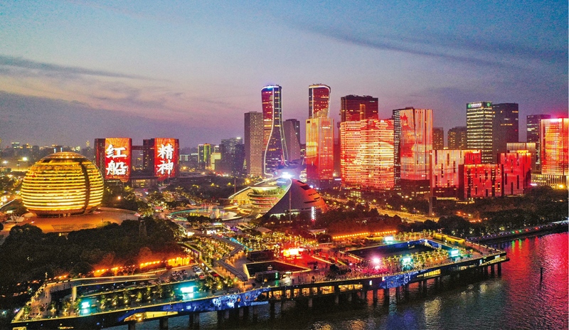 2021年6月24日晚,浙江杭州钱塘江畔上演庆祝建党100周年主题灯光秀。 人民视觉 董旭明/摄