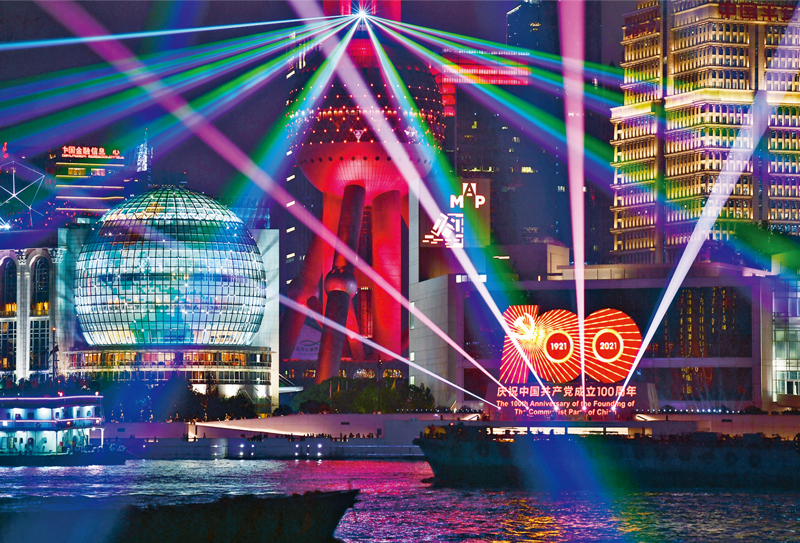2021年6月19日,上海庆祝建党百年灯光系列活动拉开序幕,黄浦江畔,灯光璀璨。 人民视觉 茅正元/摄