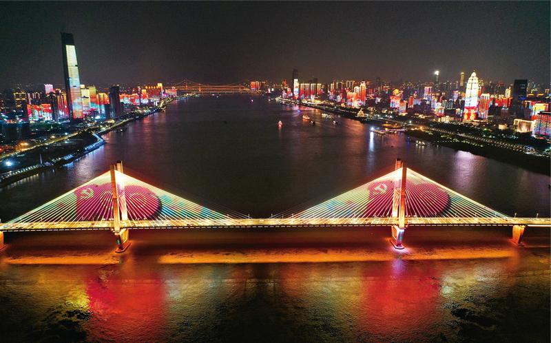 2021年6月24日晚,以“百年征程 波澜壮阔 百年初心 历久弥坚”为主题的长江灯光秀点亮湖北武汉。 人民视觉 周国强/摄