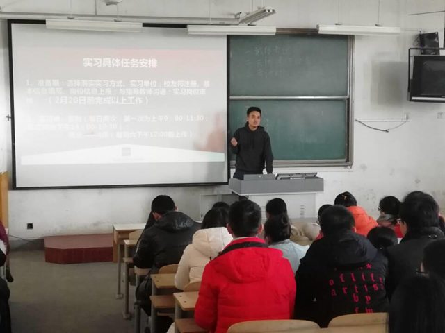 李飞老师从实习重要性、实习规定要求、校友邦实习平台操作流程等方面对参加实习的学生做了讲解,并鼓励同学们认真对待实习,积极与指导老师交流沟通,顺利完成实习任务。