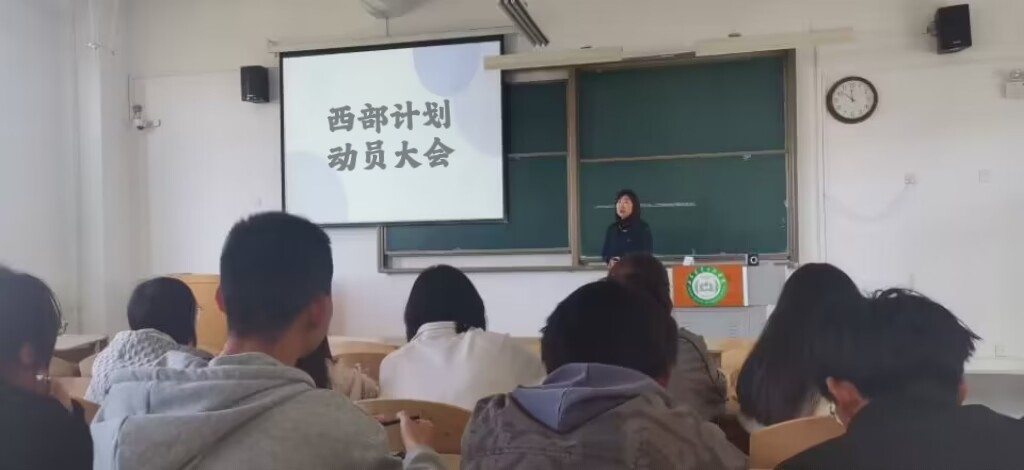 大会上,周海霞老师详细解读了西部计划的背景、目标、招募标准以及报名流程等。随后,她与同学们共同探讨了如何在乡村振兴中发挥青年作用、助力乡村振兴的路径和策略。她鼓励同学们毕业后积极投身西部,参与西部建设,弘扬志愿服务精神,将个人的理想追求与国家的发展需要相结合,为实现乡村振兴战略贡献青春力量。
