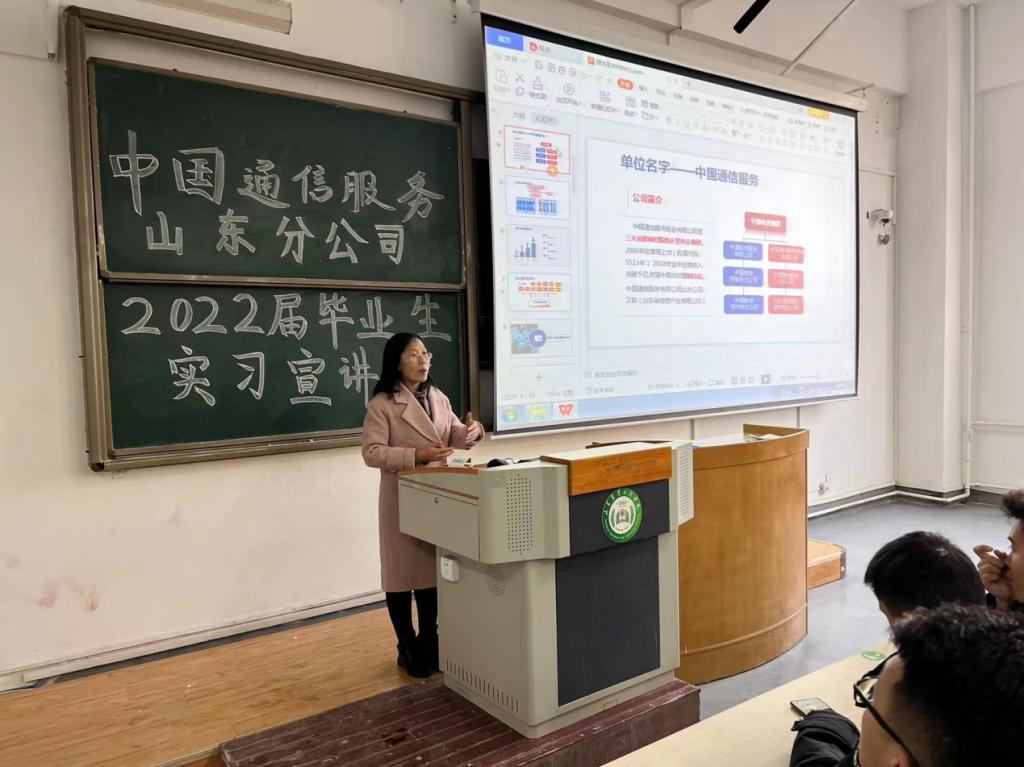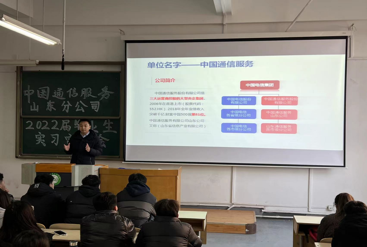 李林经理向同学们介绍了中国通信服务山东分公司的发展历程、机构设置、业务类型和运营模式等。中国通信服务山东分公司是中国通信服务股份有限公司的全资子公司,注册资本1亿元。公司拥有先进的技术、完备的资质、优秀的管理团队,致力为国内外通信运营商、信息和媒体运营商、政府及企业客户等提供专业的一体化服务,业务涵盖通信技术开发、服务、咨询等。王韬经理详细说明了企业能够为2022届毕业实习提供的岗位种类和职位要求,并与学生代表就有关实习的问题进行了深入的交流。王经理说:同学们要通过毕业实习,积极调整就业心态、转变就业观念,适应工作岗位,为顺利进入社会奠定良好的基础。