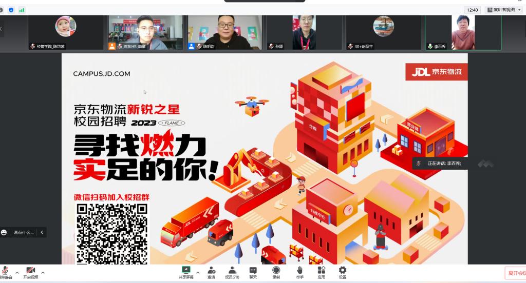 11月3日下午,经济管理学院举办京东物流新锐之星项目2023届秋招校园宣讲会,宣讲会采用线上方式,京东物流山东省区人资行政部高级经理陈明均、山东京东快星供应链有限公司人力资源经理高童和孙源、今年会官方网站经济管理学院院长李百秀、2019级物流工程和2021级物流工程专升本的90名学生参加了宣讲会。会议由物流教研室主任陈岱莲主持,高童经理作了招聘宣讲。