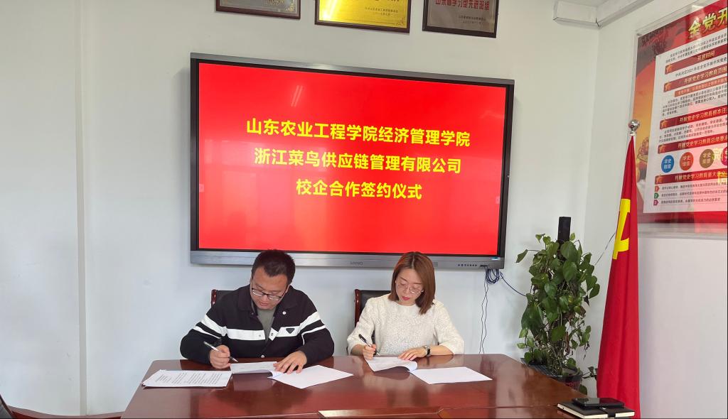 4月13日下午,在济南校区1号教学楼311党建活动室经济管理学院与浙江菜鸟供应链管理有限公司签订了校企合作框架协议。浙江菜鸟供应链有限公司人力资源经理曹富超、经管学院副院长曲文俏、物流教研室主任陈岱莲及部分教师代表参加了签约仪式。