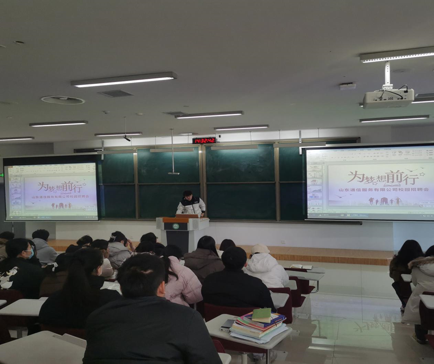 活动中,通服宣讲人从公司概况、发展历史、产品及服务领域、品牌影响力等方面让同学们更加了解中国通信服务公司。然后又向同学们详细介绍了本次山东公司招聘的岗位、员工福利待遇和校招流程等。在互动环节同学们积极询问自己所关心的职务岗位、工作内容、工作地点等问题,宣讲人也都一一为同学们作出解答。
