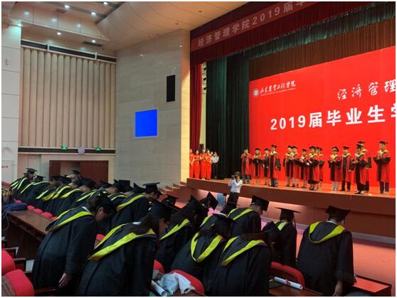 在学位授予仪式上经济管理学院学位委员会委员颜素杰、李百秀、沙鸣、刘建廷教授为毕业生颁发学位证书。微笑、握手、拨穗、授证、合影……每一个瞬间都是学子们成长中的难忘时刻。最后,全体毕业生起立向台上的各位导师行谢师礼,经济管理学院2019届毕业生学位授予仪式暨颁奖典礼在《欢送进行曲》的音乐声中圆满结束。