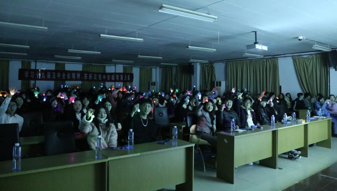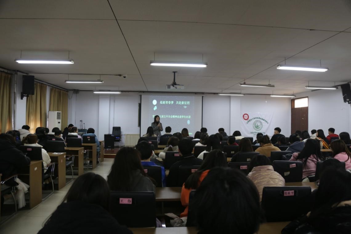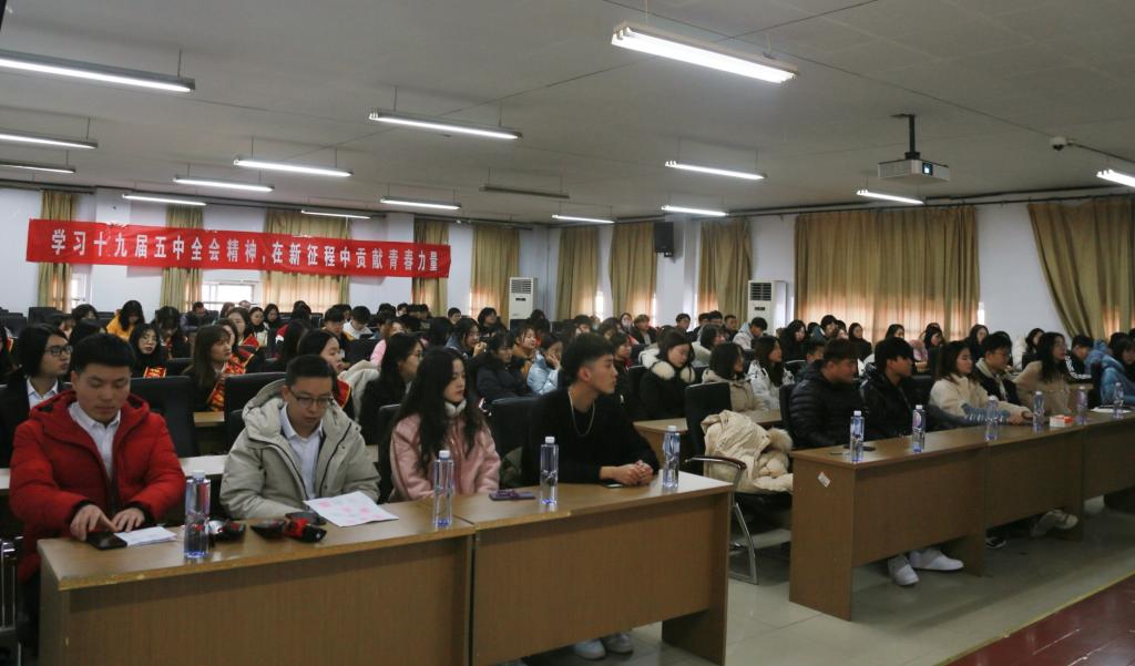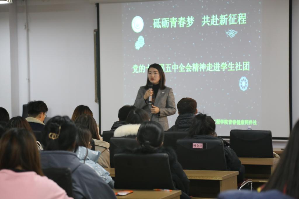 2020年12月31日下午,党的十九届五中全会精神走进学生社团活动在济北校区培训楼五楼报告厅举行。山东省属高校学习贯彻党的十九届五中全会精神宣讲团成员、经济管理学院辅导员张娟走进学生社团,以“青春梦 共赴新征程”为主题进行宣讲,经济管理学院部分学生党员及青春健康同伴社全体成员参加此次活动。