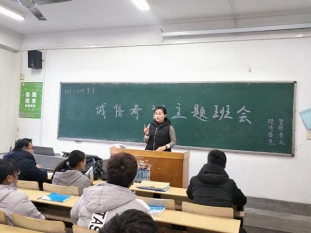 2017-2018学年期末考试临近,经济管理学院各专业分别开展  “诚信考试”主题教育活动,活动由各班班长主持,专业辅导员老师,学生干部和全体同学参加了此次活动。