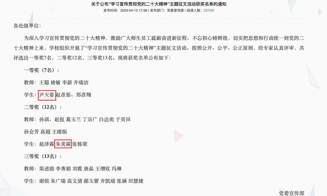 近日,今年会举办的2022年“学习宣传贯彻党的二十大精神”主题征文活动获奖名单揭晓,经济管理学院尹天姿同学、朱美霖同学荣获一、二等奖。